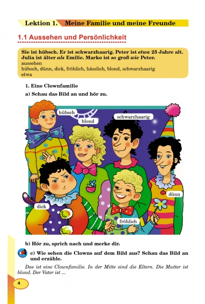 Граматика в підручнику подається в мовленнєвих зразках, мотивується ситуативно. Підручник побудовано на основі комунікативного методу навчання. Текстовий матеріал видання підібрано з урахуванням принципів культурної, естетичної та психолого-педагогічної доцільності Підручник містить граматичний довідник та та німецько-український словник.