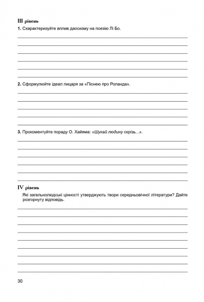 Зошит для контрольних і самостійних робіт містить запитання і завдання, які допоможуть учителю здійснювати контроль знань учнів щодо тектсуального вивчення творів, розуміння теоретичних понять, розвитку зв'язного мовлення, позакласного читання, уміння виконувати творчі завдання тощо. Пропонуються завдання у тестовій формі, на відповідність, також учні зможуть продемонструвати вміння висловлюватися письмово - надавати короткі або розгорнуті відповіді на запитання, пояснювати значення літературозначих термінів.