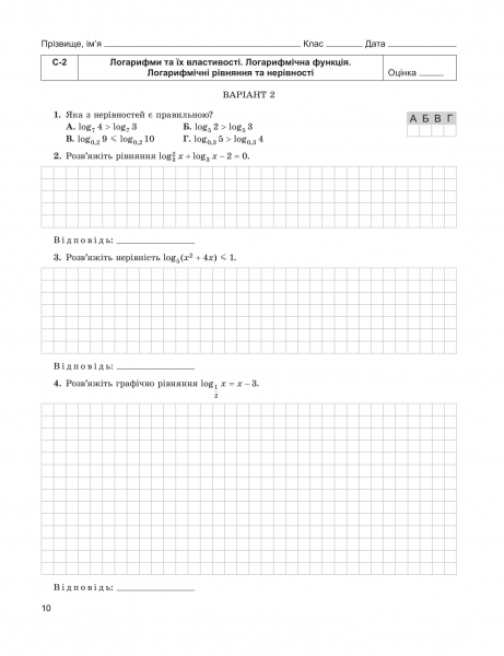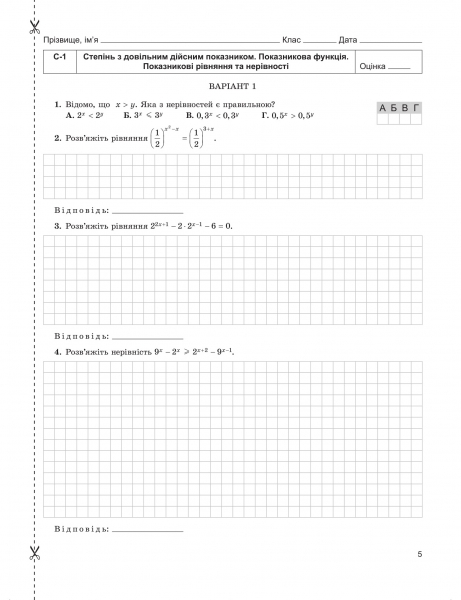 Посібник містить повну добірку самостійних та тематичних контрольних робіт з курсу алгебри і початків аналізу 11-го класу (рівень стандарту) відповідно до чинної навчальної програми для ЗЗСО. Завдання кожної роботи диференційовано за рівнями оцінювання навчальних досягнень учнів. У передмові надано методичні рекомендації щодо проведення, оформлення та оцінювання робіт. Для зручності користування посібником передбачено місце для запису розв'язань і відповідей.