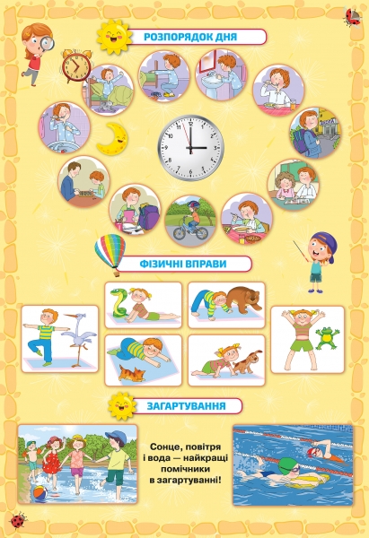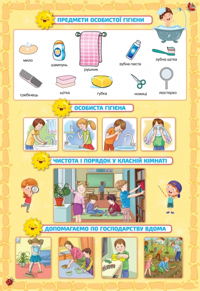 1. Моя школа. 2. Розпорядок дня. Фізичні вправи. Загартування. 3. Предмети особистої гігієни. Особиста гігієна. Чистота і порядок у власній кімнаті. Допомагаємо по господарству вдома. 4. Як я росту. Моя постава. 5. Будова людини. 6. Органи чуття. 7. Кімнатні рослини. Догляд за кімнатними рослинами. 8. Прилади, які допомагають досліджувати природу. 9. Нежива й жива природа. Природні та рукотворні тіла. 10. Будова рослини. Етапи розвитку рослини. Умови, необхідні рослинам для життя. 11. Листяні та хвойні рослини. 12. Дерева. Кущі. Трав'янисті рослини. Культурні рослини. 13. Фрукти. Овочі. 14. Дикі тварини. Свійські тварини. Домашні улюбленці. 15.Комахи. 16.Риби. 17.Птахи. 18.Звірі. 19.Ззначення рослин для людини. Значення тварин для людини. 20.Забруднення довкілля. Охорога природи. Червона книга України. 21.Піраміда харчування. 22.Моя родина. Обов'язки в родині. 23.Природні та штучні матеріали. Винаходи людства. 24.Пожежно-рятувальна служба. Поліція. Швидка медична допомога. 25.Безпечна ждорога до школи. Правила дорожнього руху. Дорожні знаки. 26.Україна - моя Батьківщина. Державні символи України. 27.Учимося взаємодіяти. Доброчинність. Правила безпечної поведінки. 28.Громадські місця. Правила поведінки в громадських місцях. 29.Кола спілкування. 30.Емоції. Життєрадісність.