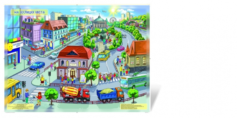 Видання допомагає унаочнити таку актуальну тему сьогодення – місто (міське населення України майже удвічі перевищує сільське). Зазначимо, що ознайомлення з містом, його інфраструктурою важливе для всіх дітей, незалежно мешкають вони в місті чи селі. Під час занять діти оволодіватимуть необхідними компетентностями, розвиватимуть уміння спілкуватися, комунікувати з оточуючим світом, з однолітками та дорослими, з тими, хто поряд. До розгляду запропоновано 8 плакатів за темами: